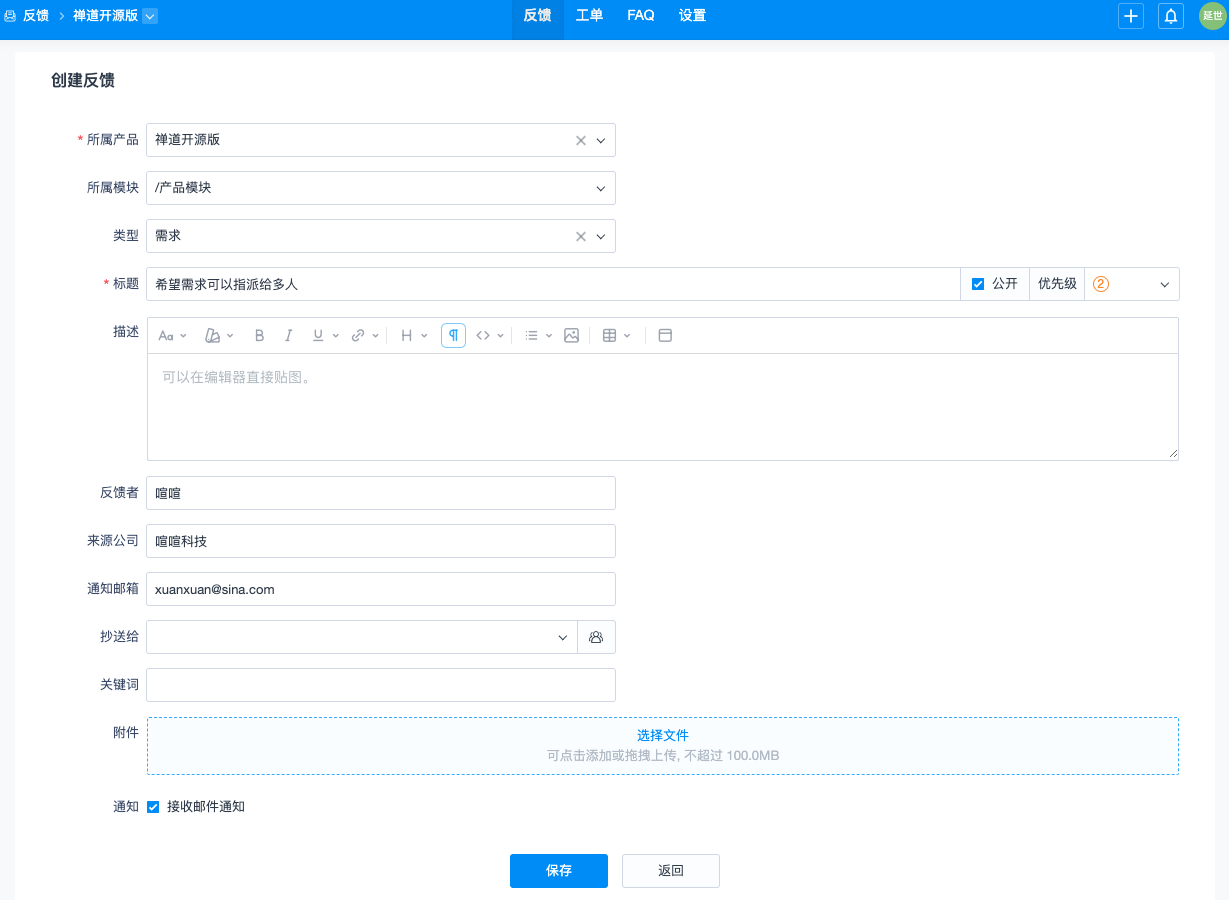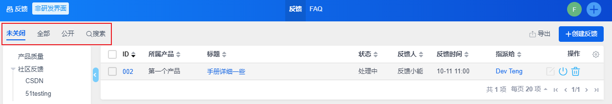 - 如果选择将该反馈公开,反馈中有该产品权限的用户都可以查看到。