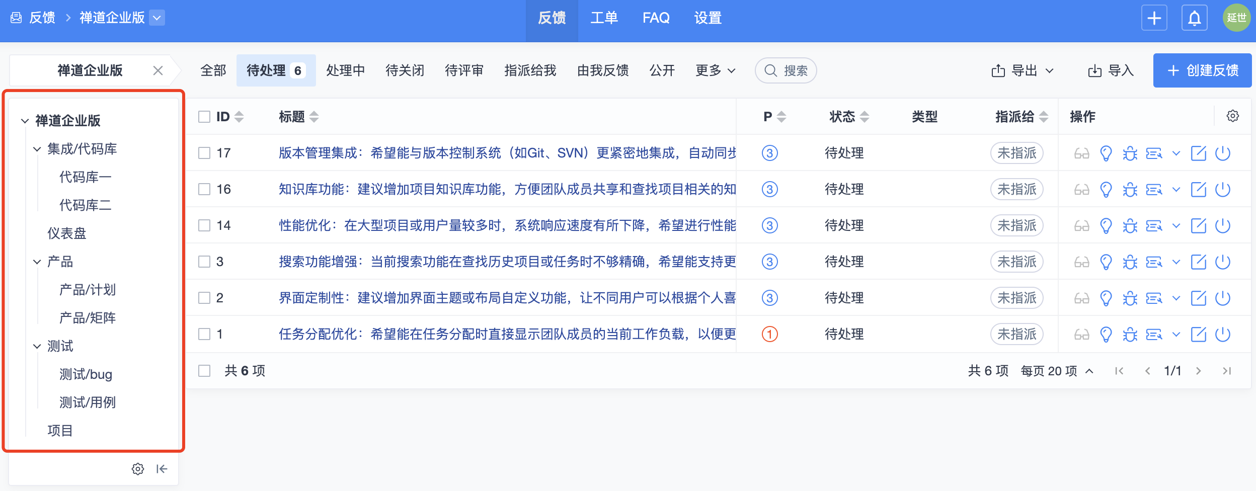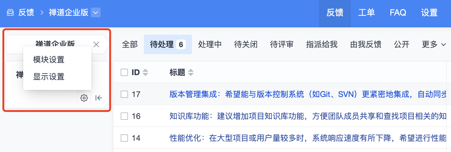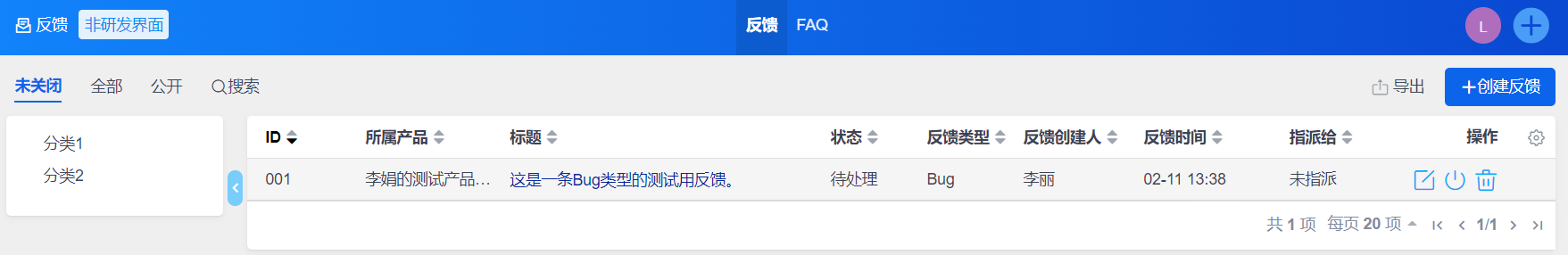 维护或者同步产品模块后,返回对应产品反馈列表,则可在左侧看到模块信息。
