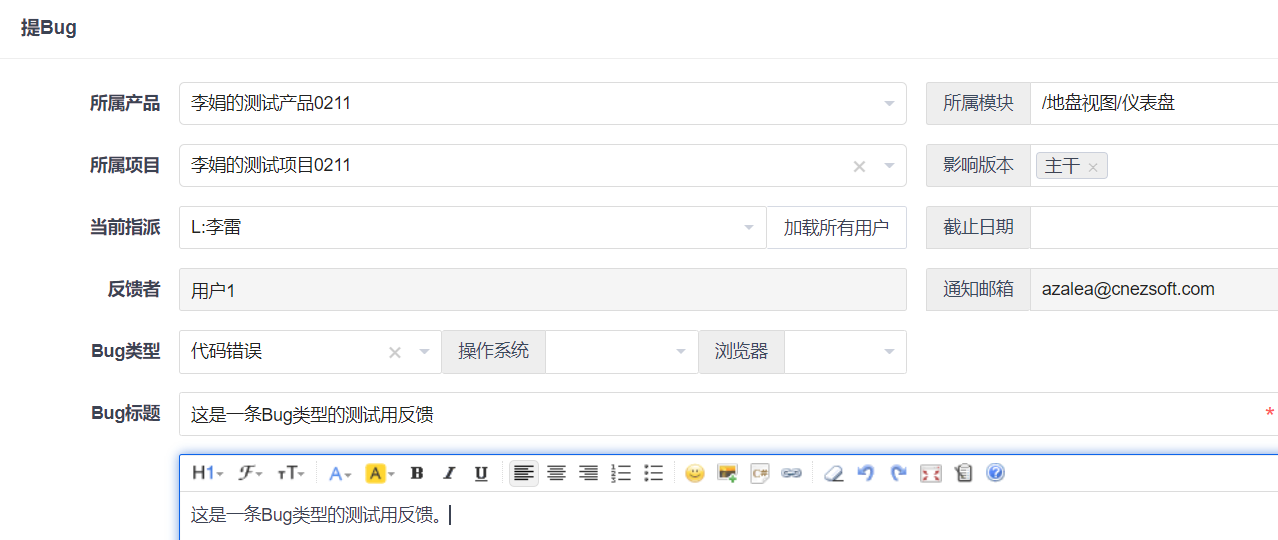 反馈的标题、所属产品、模块、类型、描述、优先级、附件等信息会默认带入到Bug信息中。