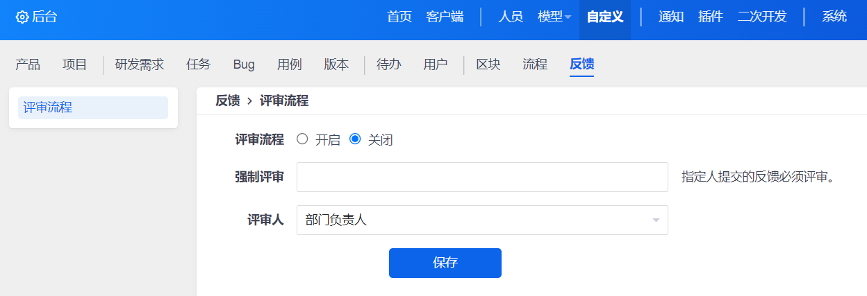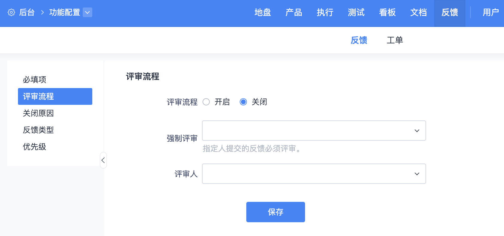 反馈默认是不开启评审,需要开启可以到后台--功能配置--反馈里开启并设置评审人员。开启评审的情况下,可以设置不需要评审的人员;评审人可以设置反馈负责人,或者其他人员。