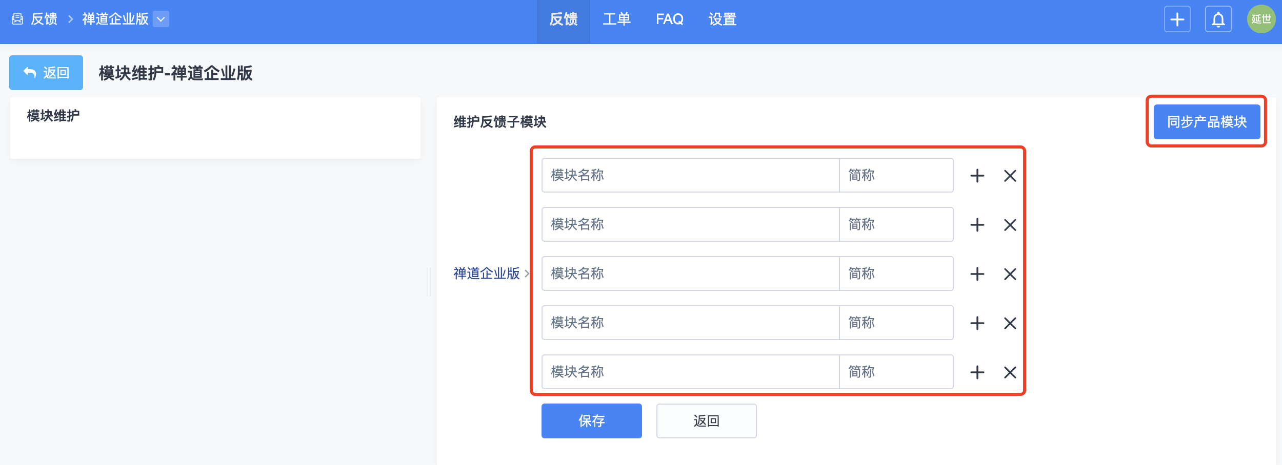 反馈的模块信息可以单独维护,也可以直接同步产品的模块。