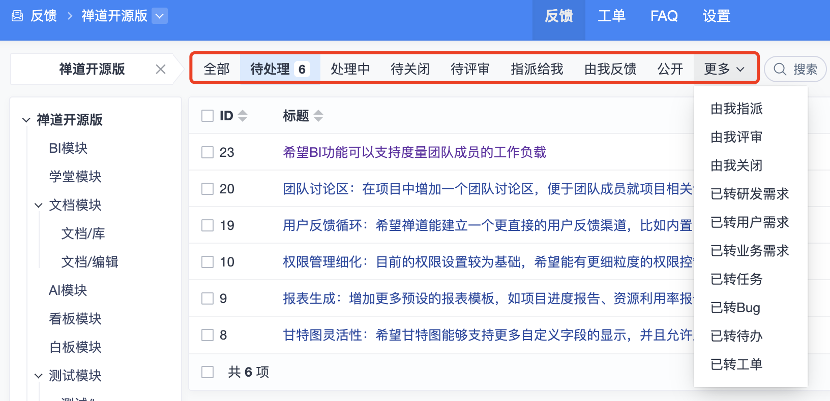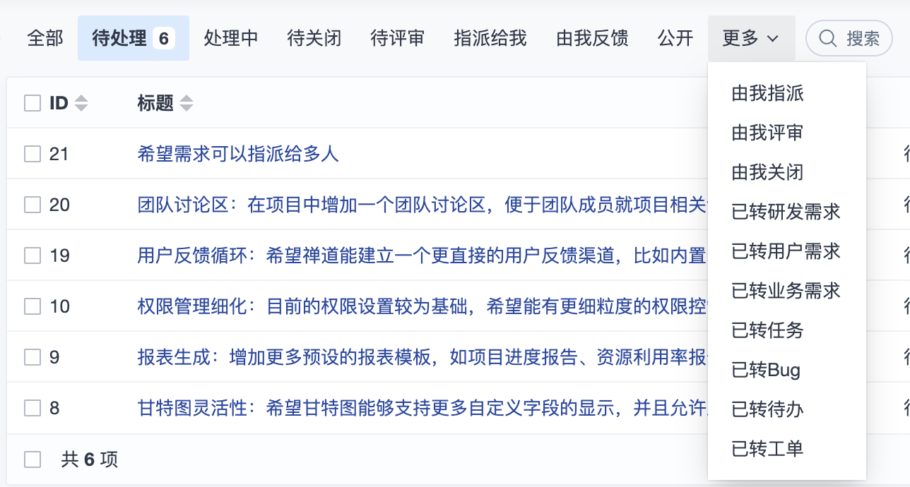 反馈列表页右侧操作栏有评审、转研发需求、转Bug、转工单、转业务需求、转用户需求、转任务、转待办和编辑、关闭按钮。