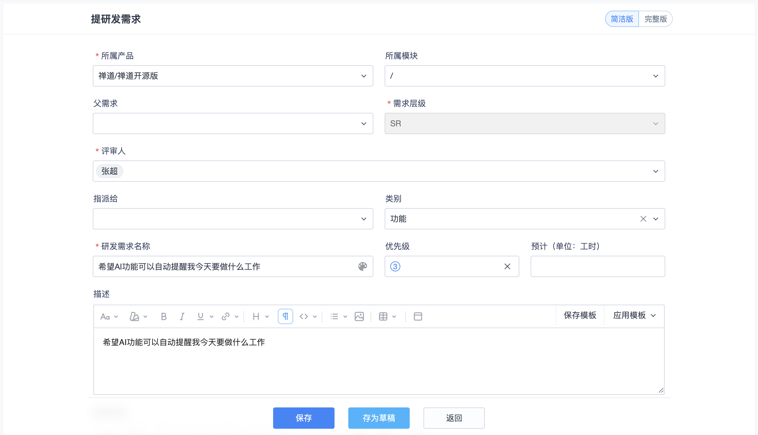 在研发界面,点击反馈列表或详情页面操作栏的“转研发需求、用户需求、业务需求”按钮,进入提需求页面。