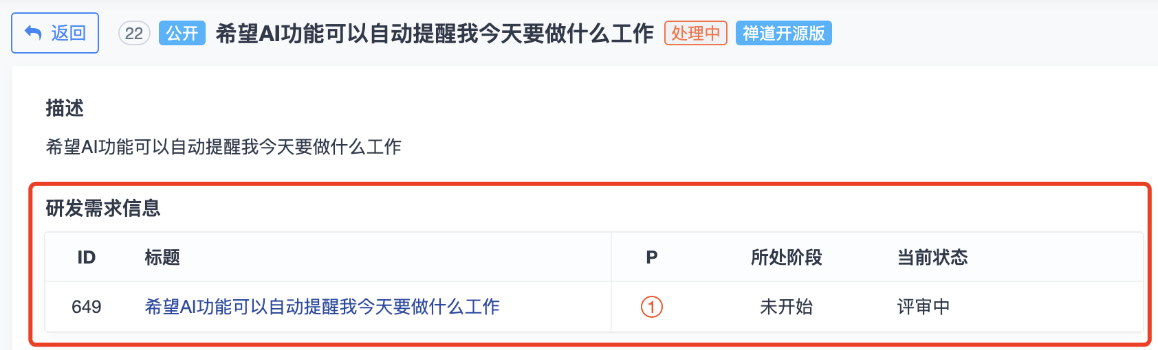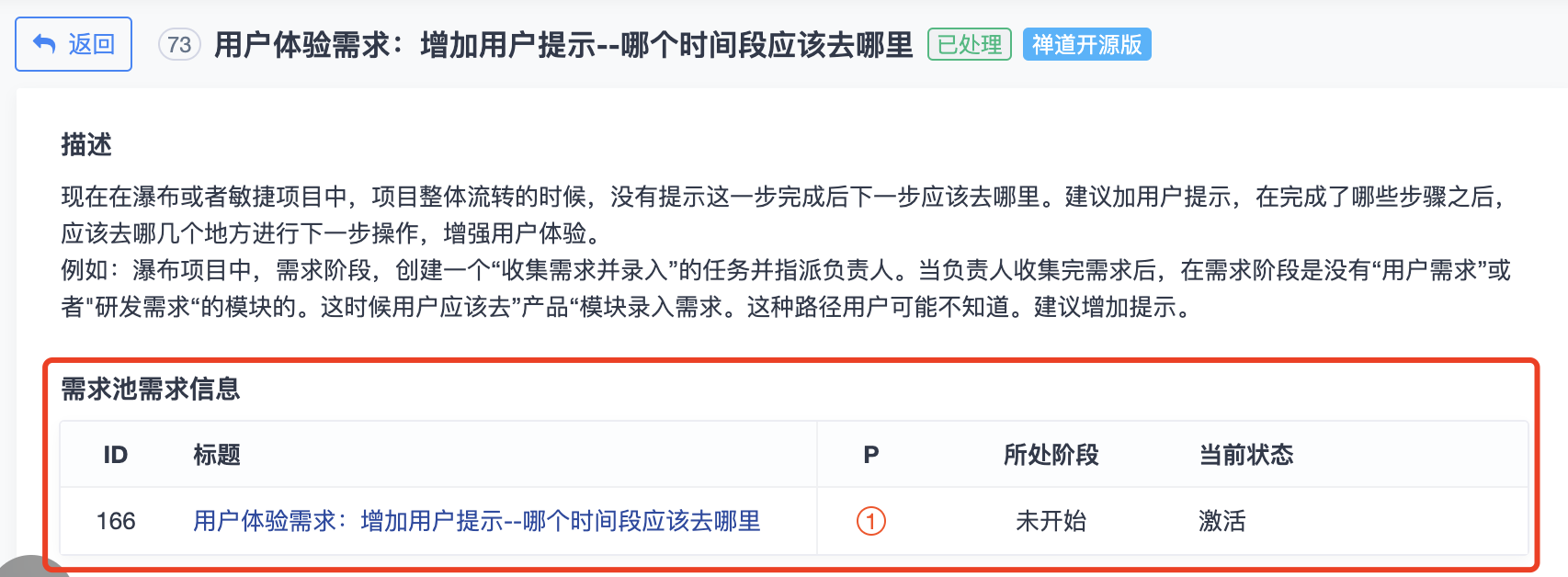 在反馈详情页面,可以查看到转为需求池需求后的信息。