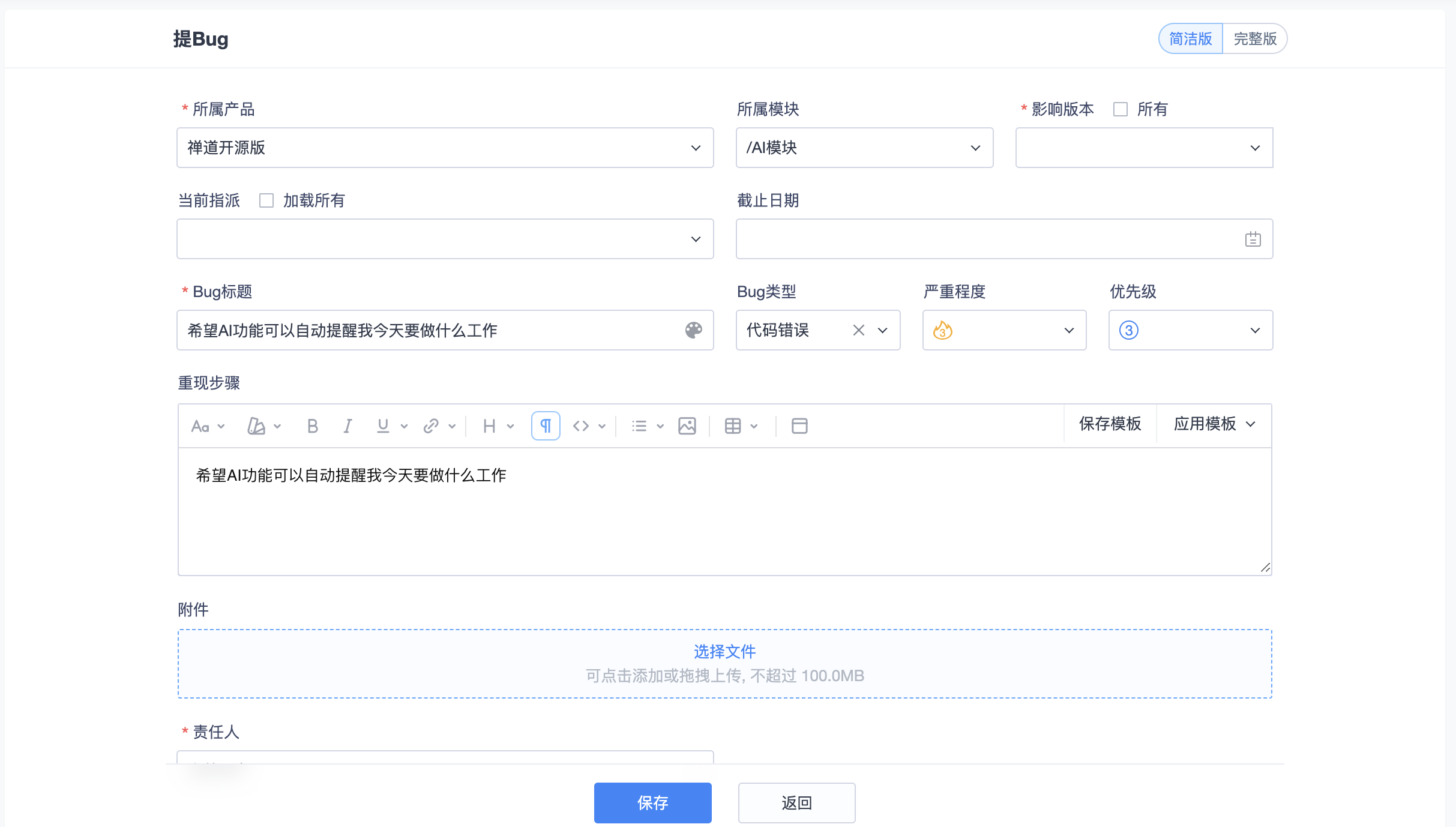 反馈的标题、所属产品、模块、类型、描述、优先级、附件等信息会默认带入到任务信息中。