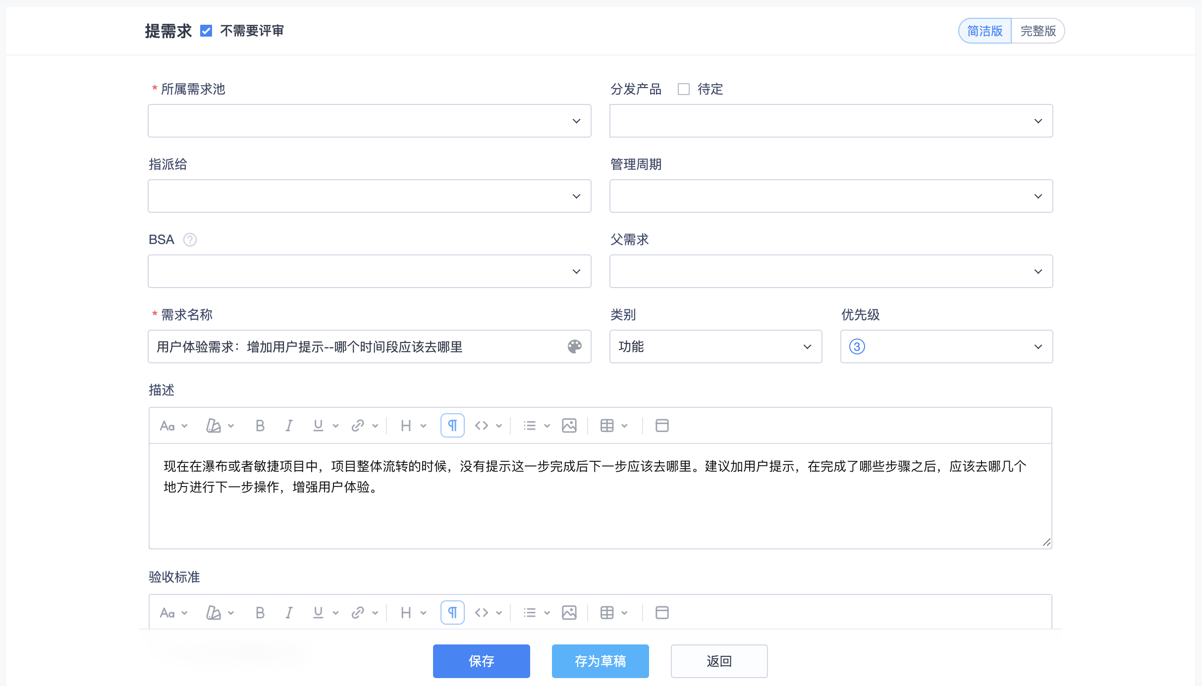 反馈的标题、描述、附件等信息会默认带入到需求池需求信息中。
