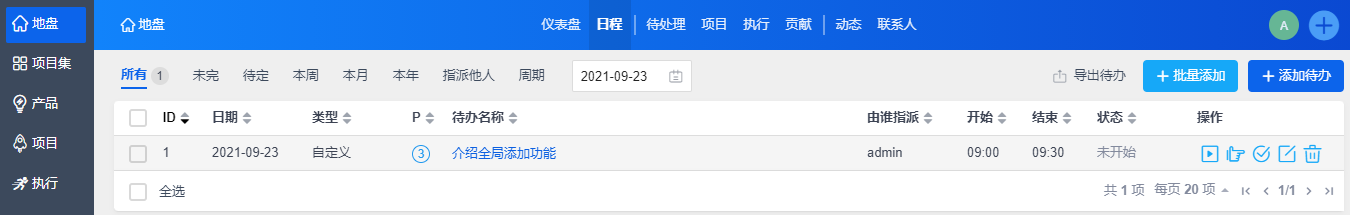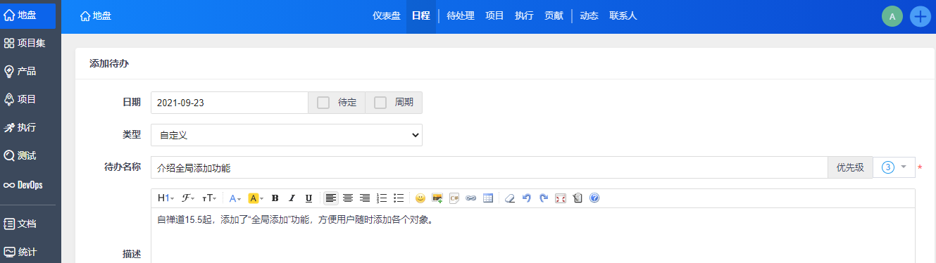 全局添加方便用户通过点击“+”直接进入添加待办、Bug、需求、任务、用例、文档、以及执行、项目、产品、和项目集的页面。