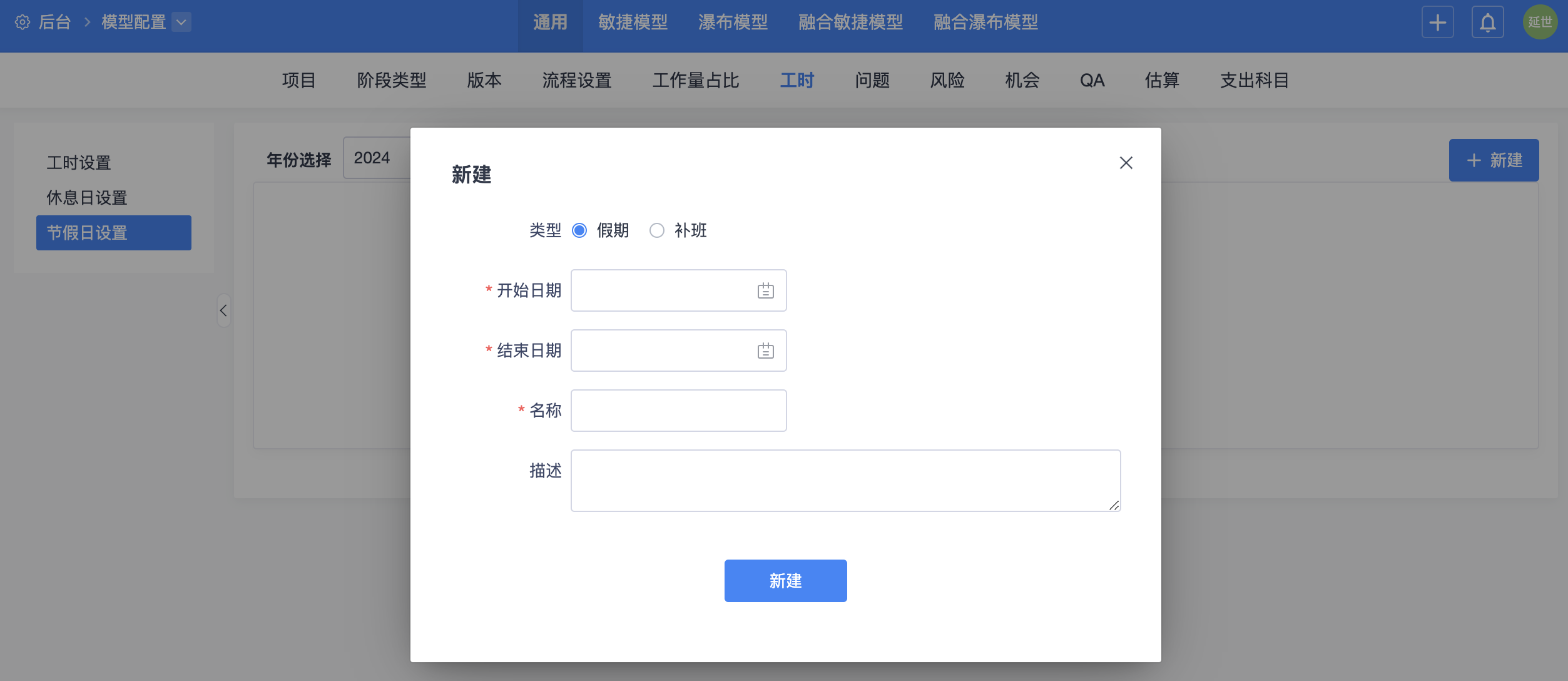 在后台-模型配置-通用-工时设置中,点击“节假日设置”-“新建”。例如:创建2024年国庆节假期。
