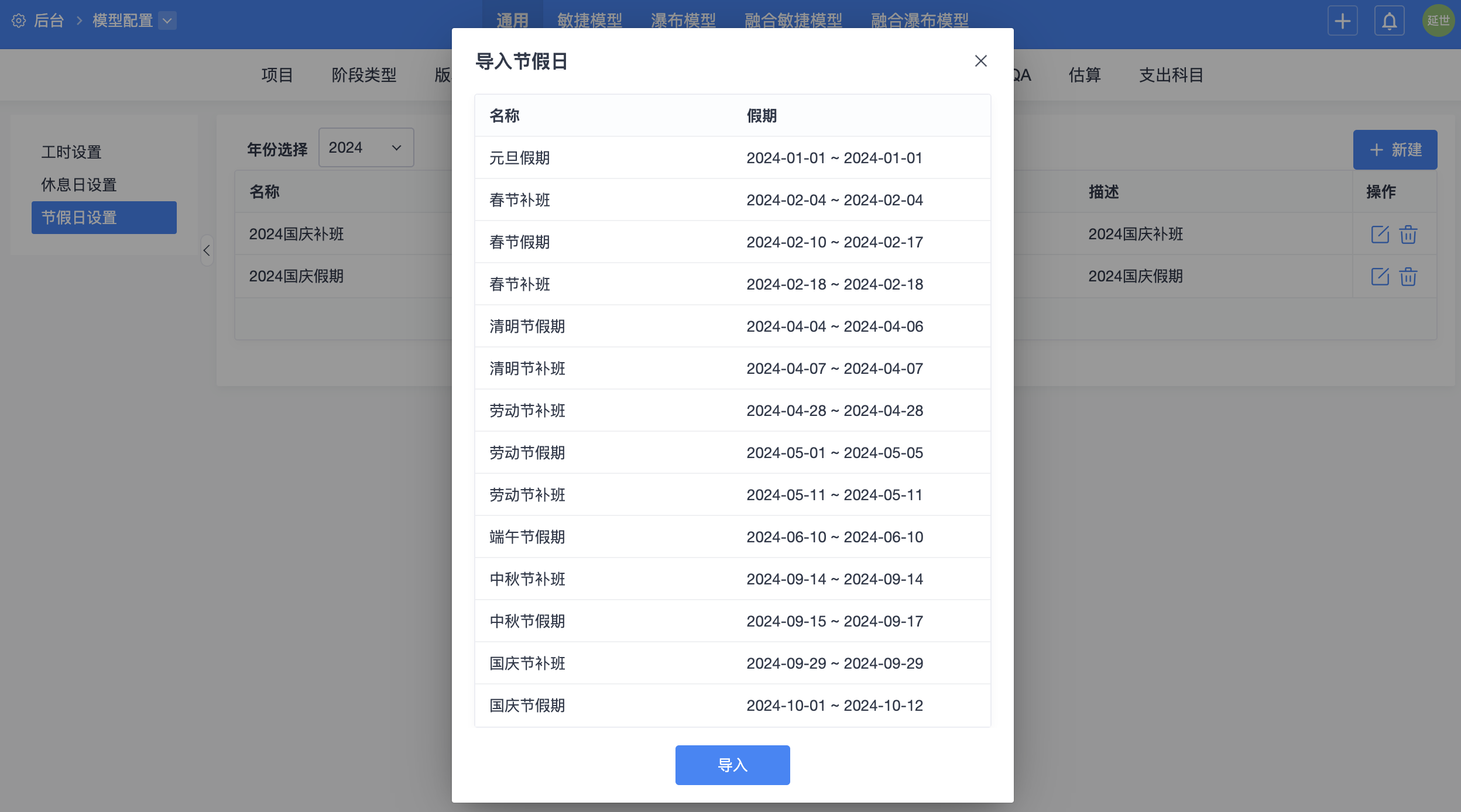 如果系统不是私有部署,可以访问公网,则可以执行“导入”功能,可以导入国家法定节假日。