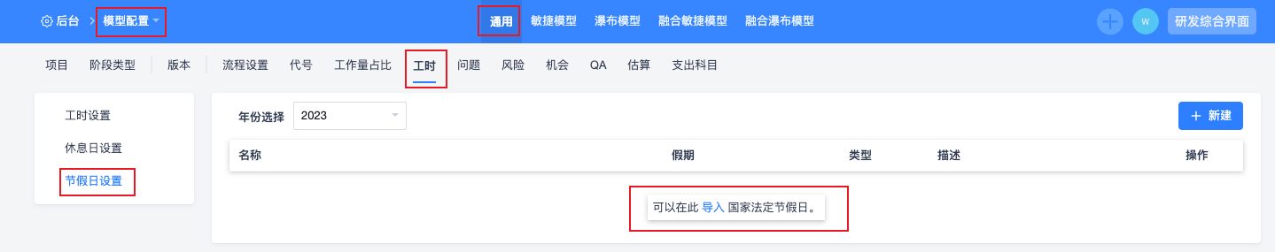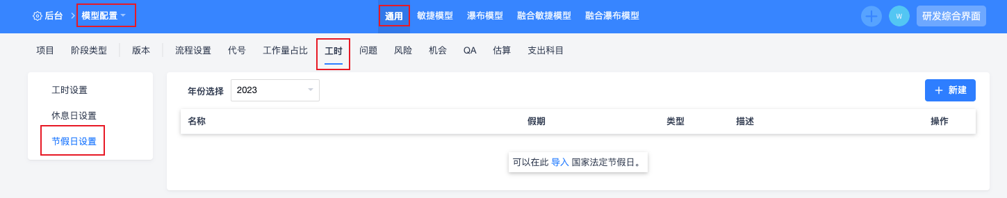 在后台-模型配置-通用-工时设置中,点击“节假日设置”-“新建”。例如:创建2024年国庆节假期。