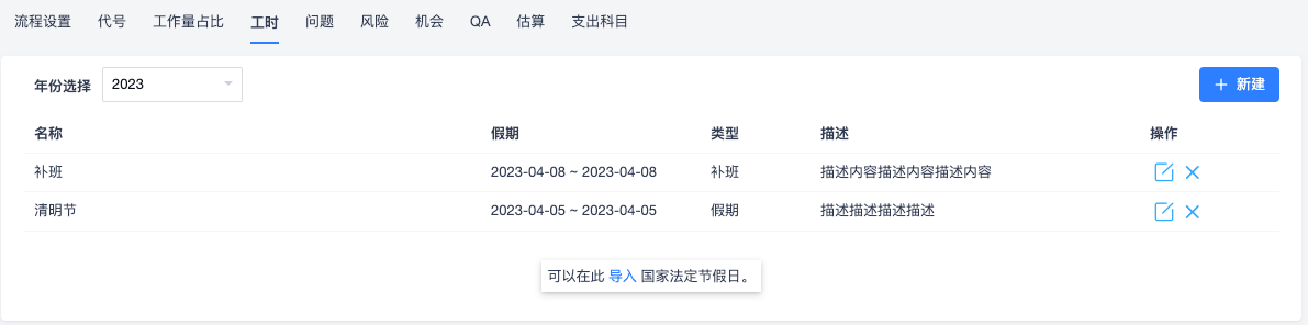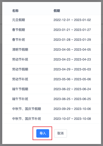 如果系统不是私有部署,可以访问公网,则可以执行“导入”功能,可以导入国家法定节假日。