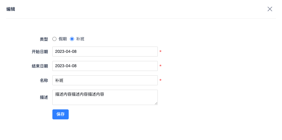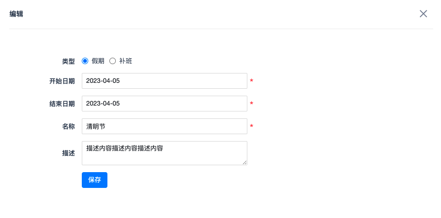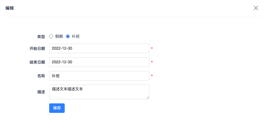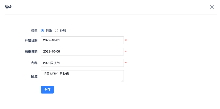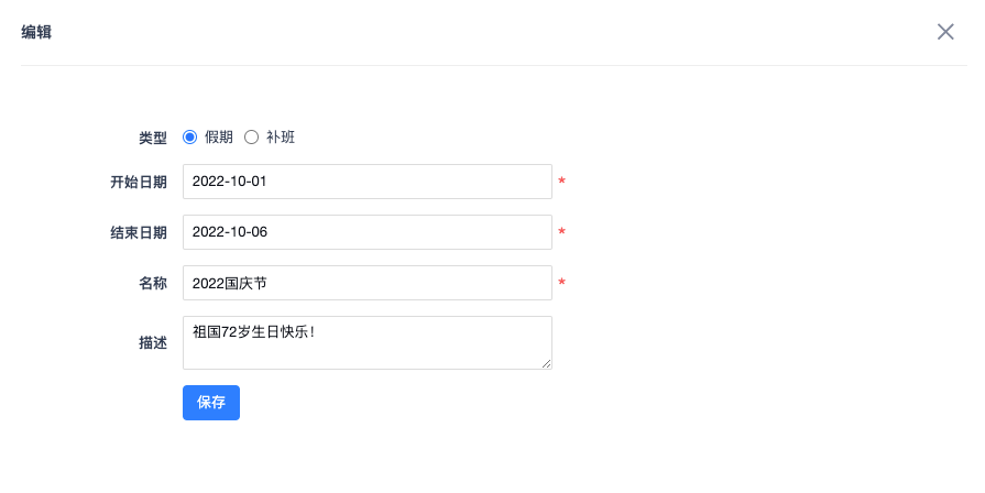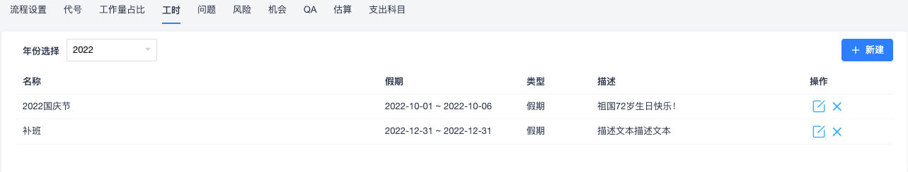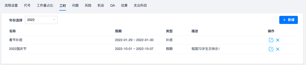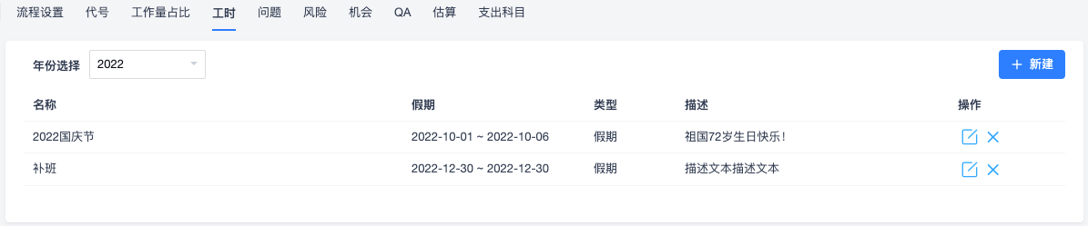 禅道中的节假日管理,可以添加假期和补班两种类型。方便节假日和调休、补班的考勤管理。