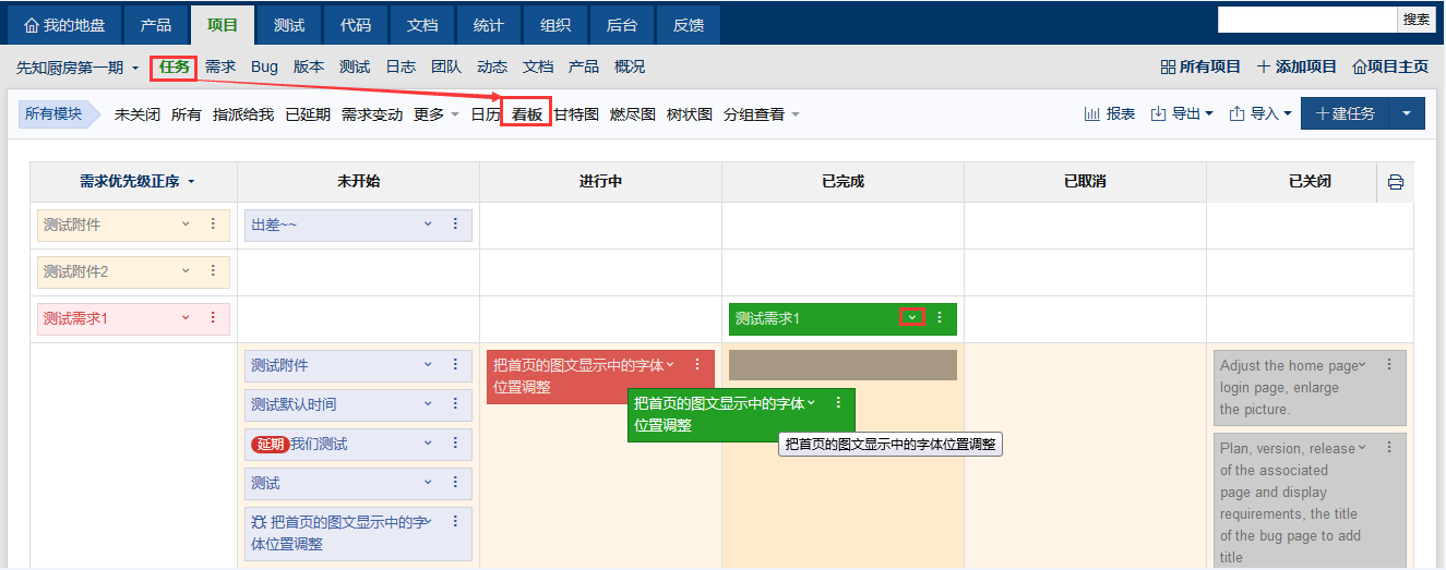 - 在看板界面可以查看当前项目(迭代)的需求以及其对应的任务列表。