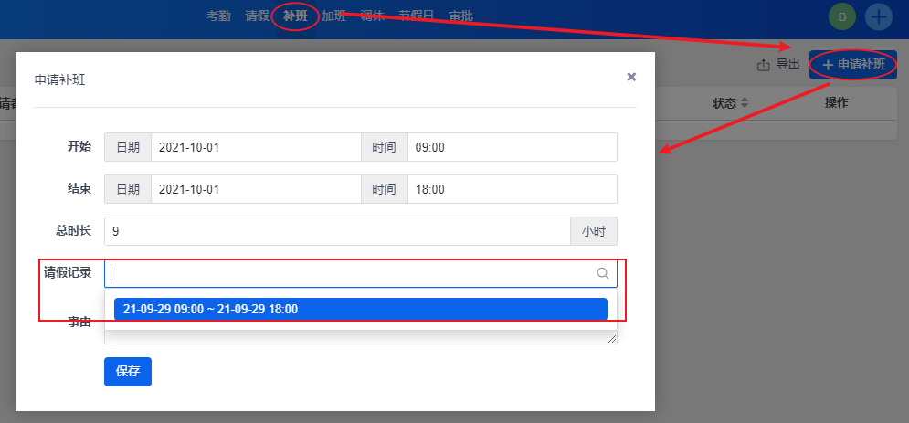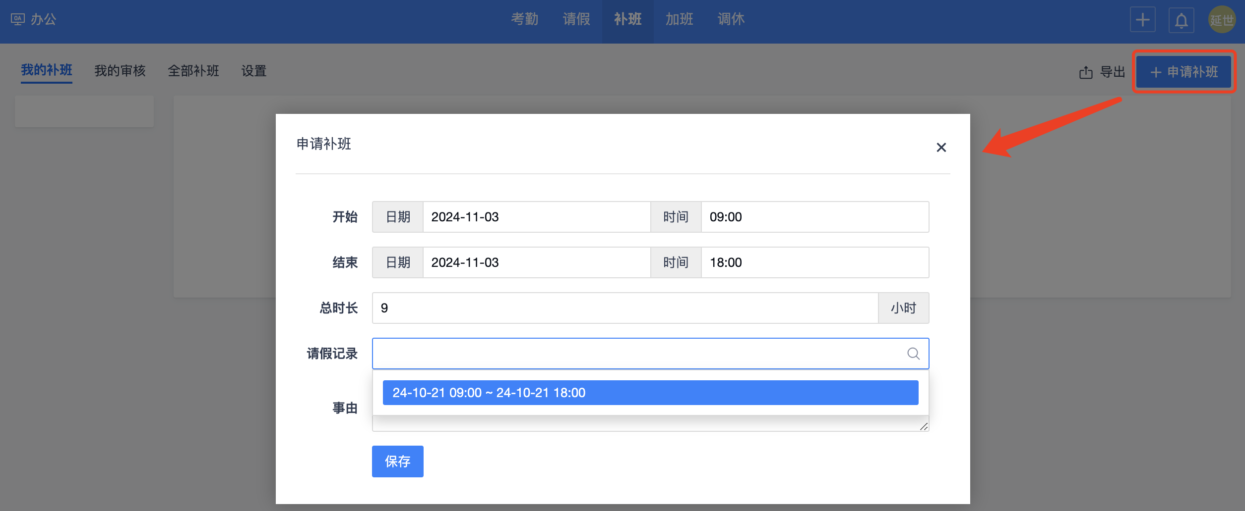 点击“补班”-“申请补班”。在“请假记录”可以选择通过批准的请假记录。