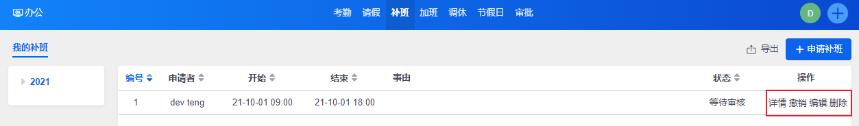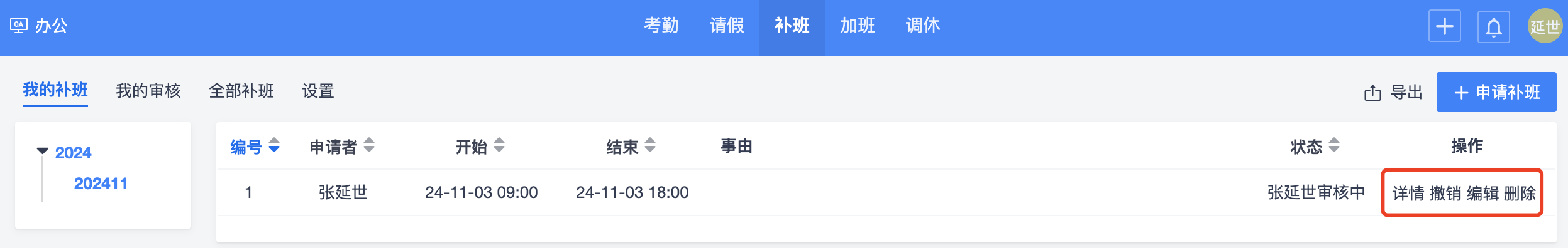点击“保存”,在“我的补班”页面可以查看自己的补班申请,也可以对补班申请进行编辑、删除和撤销操作。