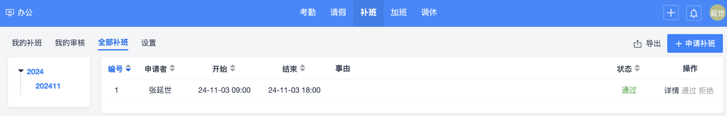拥有权限的用户可以在“全部补班”页面查看所有补班记录。