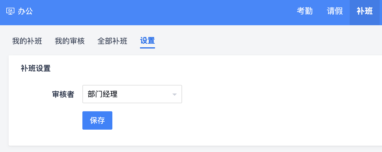 在“补班”-“设置”页面可以设置补班申请的审核者。默认为部门经理,也可以通过下拉菜单选择某个用户为审核者。