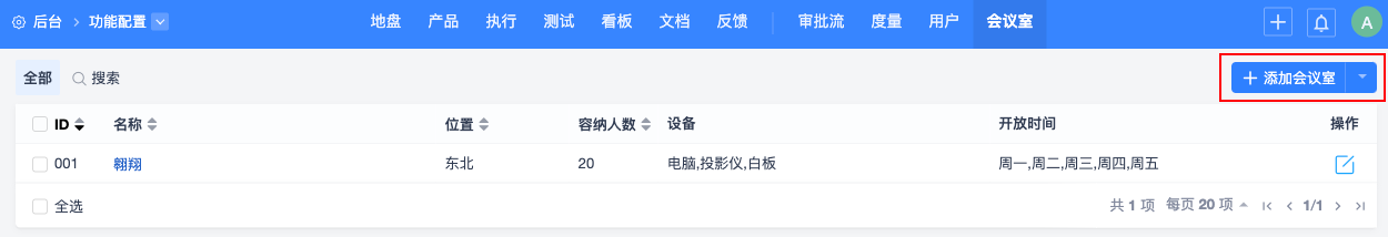 3. 在“后台”-“功能配置”-“会议室”,配置会议室,可以在创建会议中选择会议室。