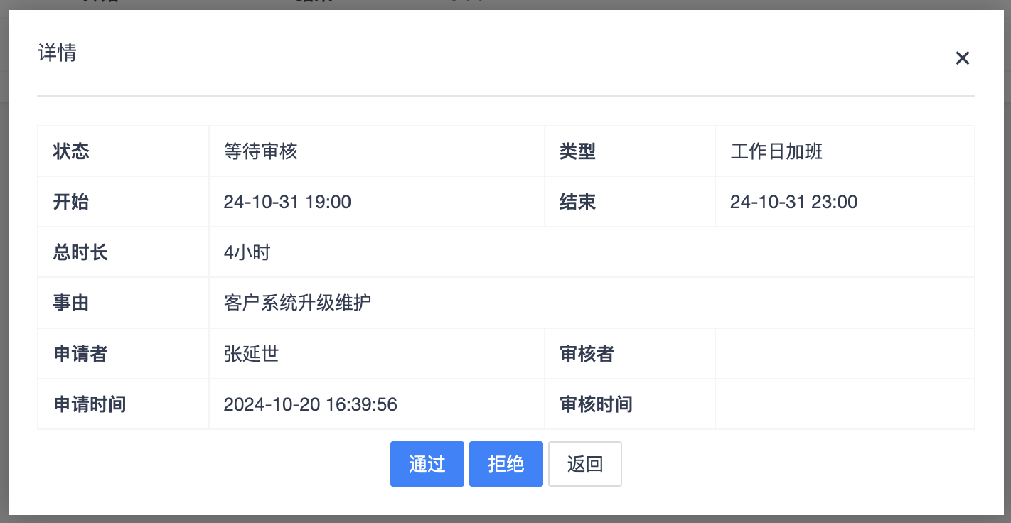 在“我的审核”页面,有审核权限的用户可以通过或拒绝本部门员工的加班申请。