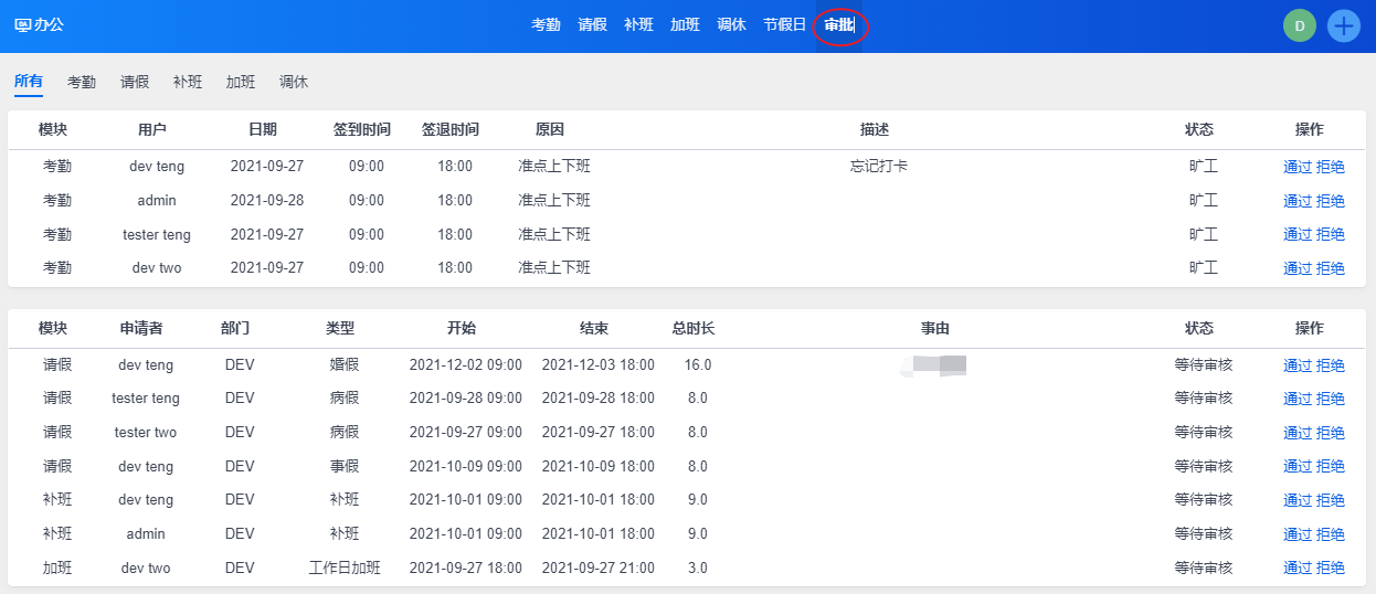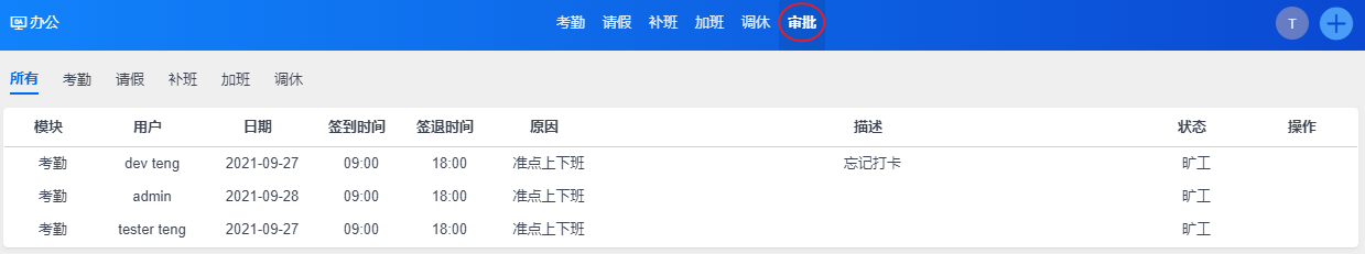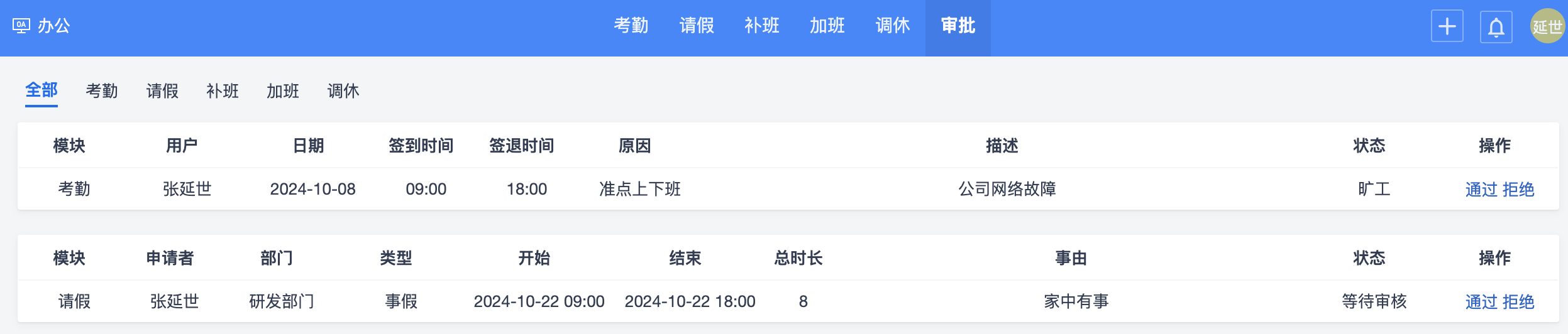 在“办公”-“审批”模块下,如果被设置为审核人,则在这里查看所有需要审核的申请。