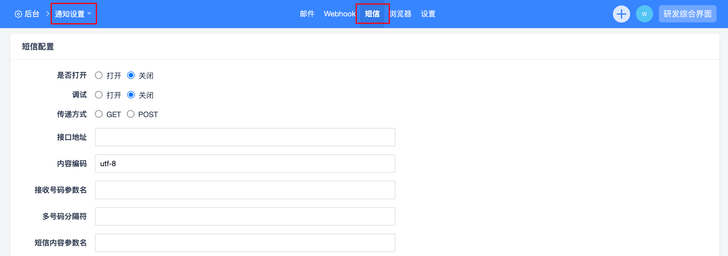注:目前短信仅支持短信网关的短信发送,暂时不支持阿里、腾讯等短信开放平台的接入。