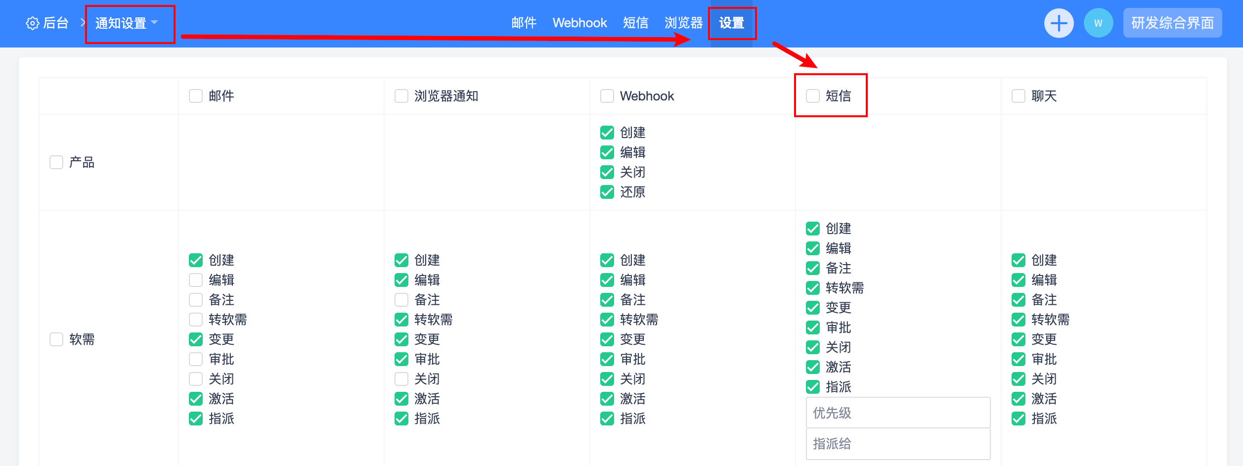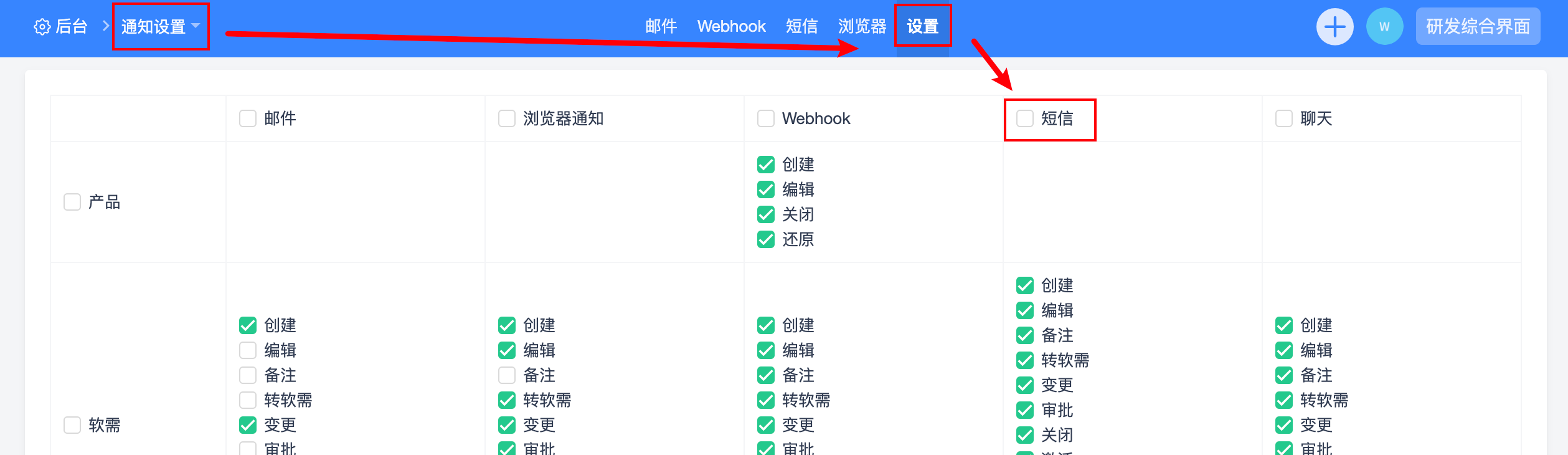 在“通知设置”-“设置”下,可以设置触发禅道发送短信提醒的动作。