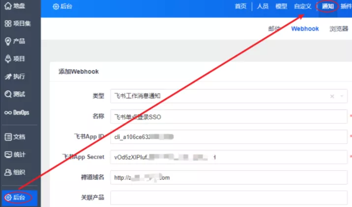 管理员账户登录禅道,点击“后台”-“通知”-“Webhook”。添加类型为“飞书工作消息”的 Webhook,并填上您的禅道域名以及将刚才获取的 ID 和 Secret (如下图所示)。
