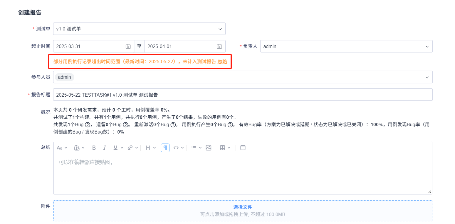 测试报告的起止时间默认为测试单的起止时间,若在测试单截至日期后仍有用户执行测试用例时,需要您手动修改测试报告的起止时间,才能把新执行的结果也统计到报告中。