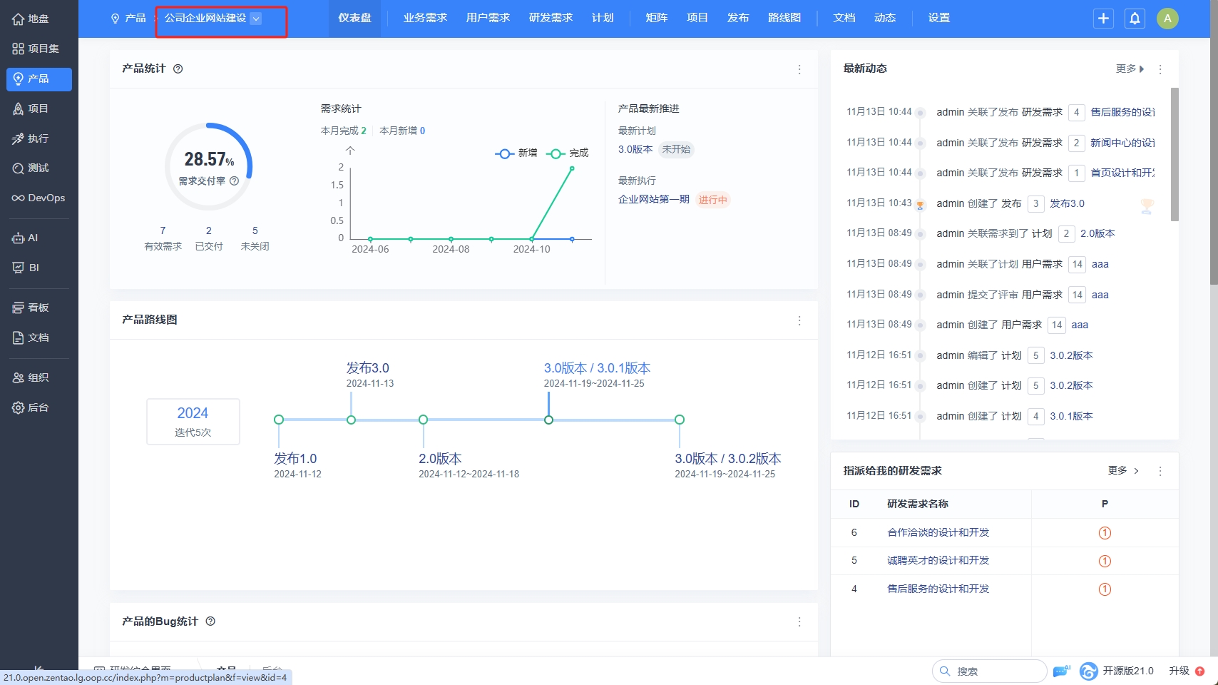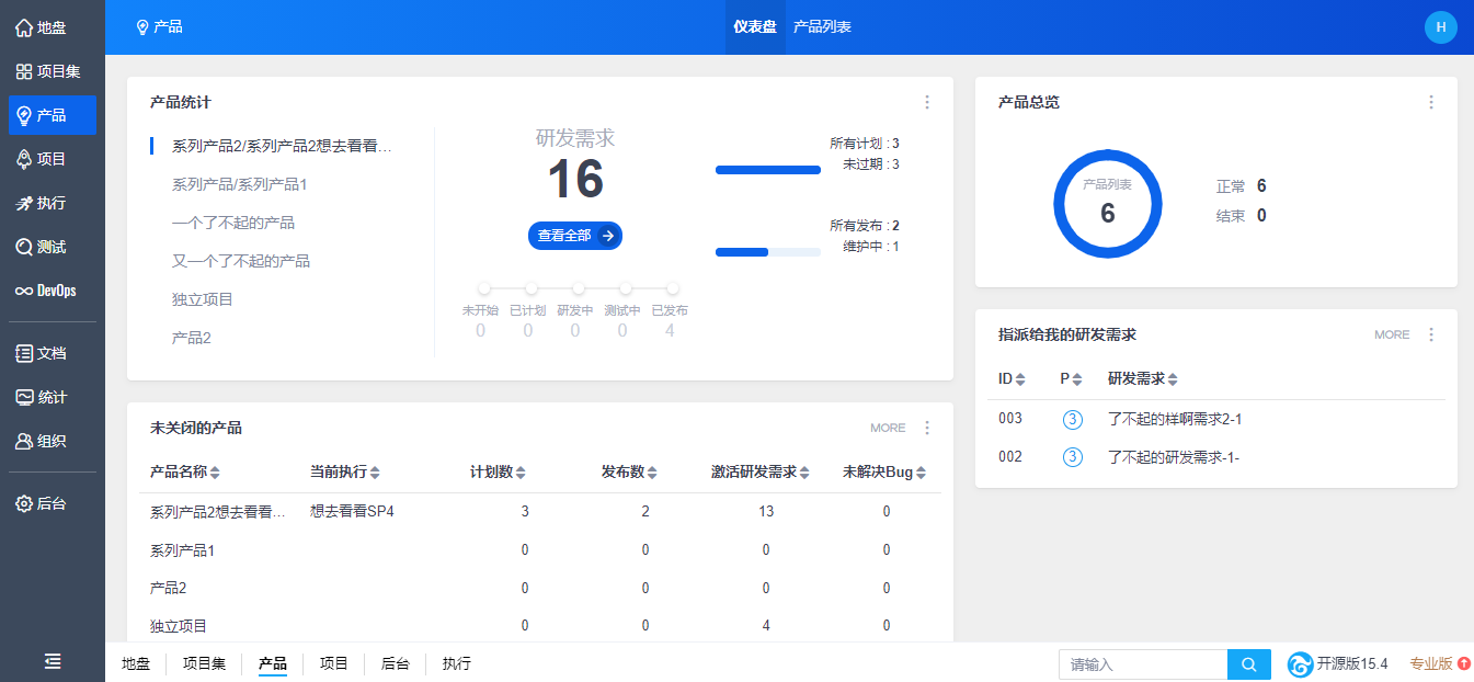 在产品模块下,仪表盘展示了禅道系统中所有产品的概况,包括,产品的研发需求、计划以及发布的数量。