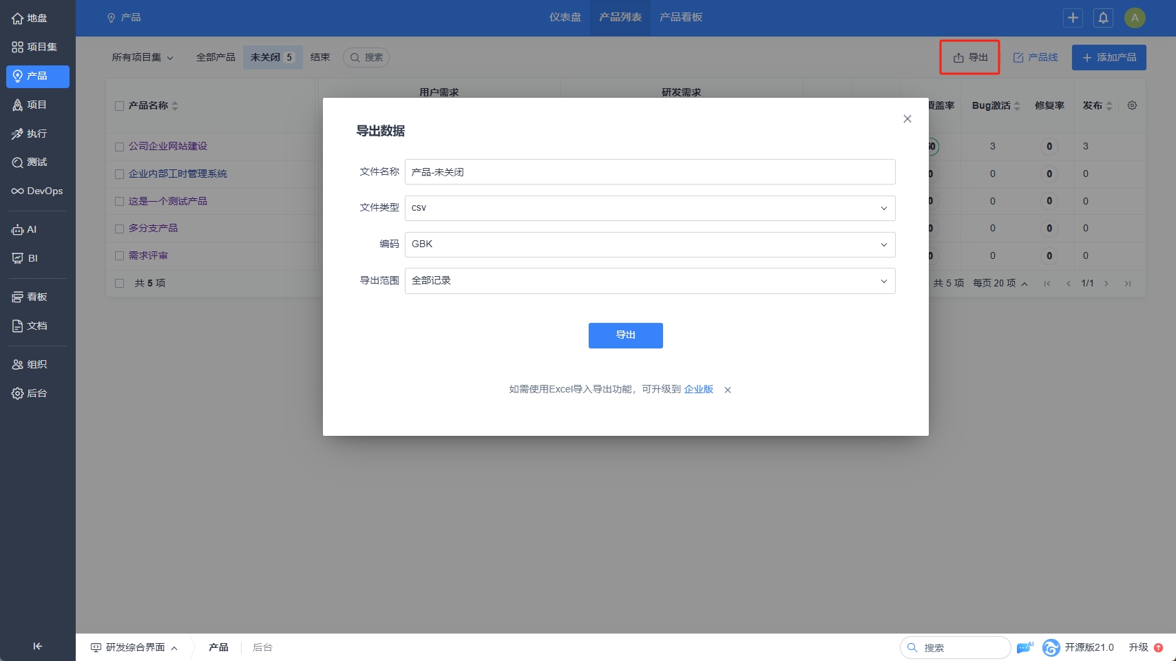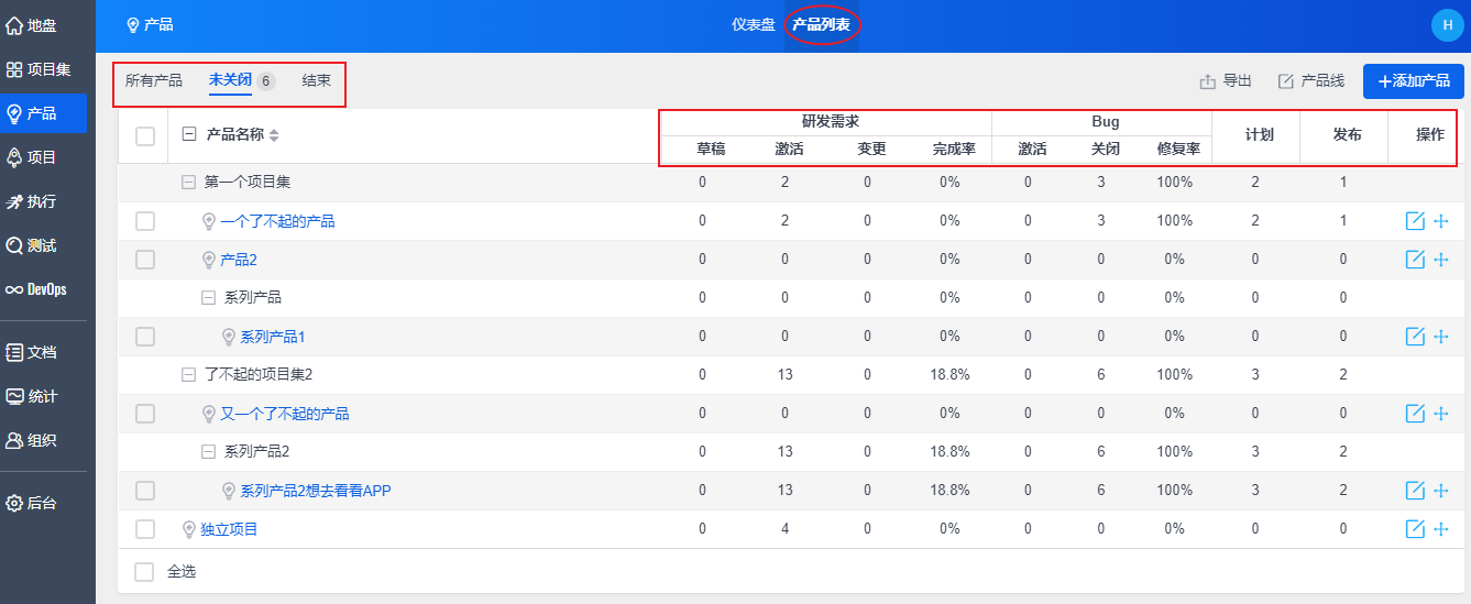 在产品列表中,还可以默认查看“未关闭”状态产品的研发需求的状态和完成率、Bug的状态和修复率、以及产品的计划和发布数。