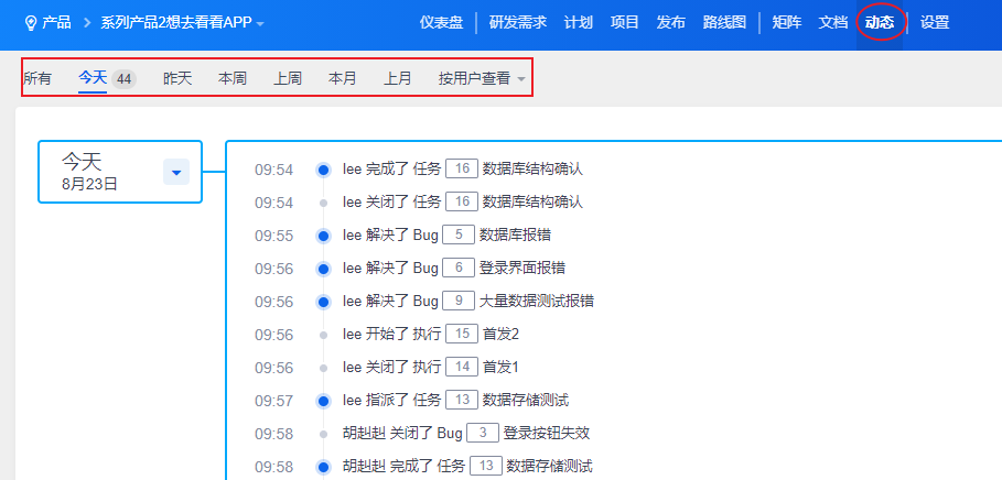 动态中展示了和产品相关的所有操作。你可以通过不同的标签和用户来查看指定之间内或某个用户关于产品的操作记录。