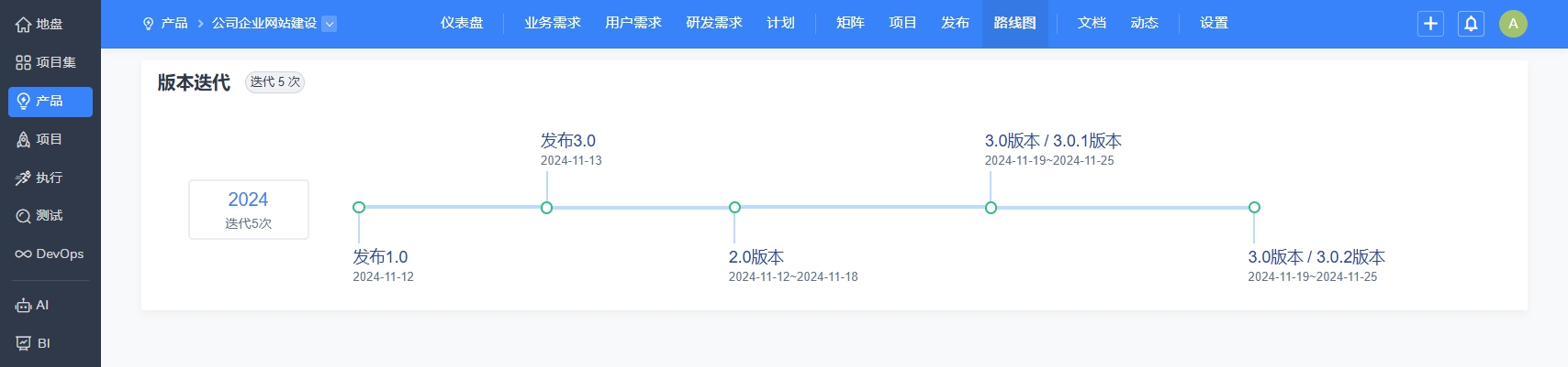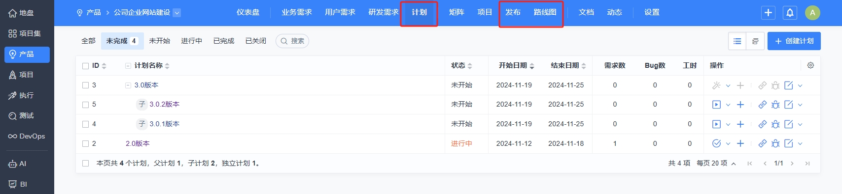 您还可以通过产品下的计划、发布和路线图查看产品的进度。