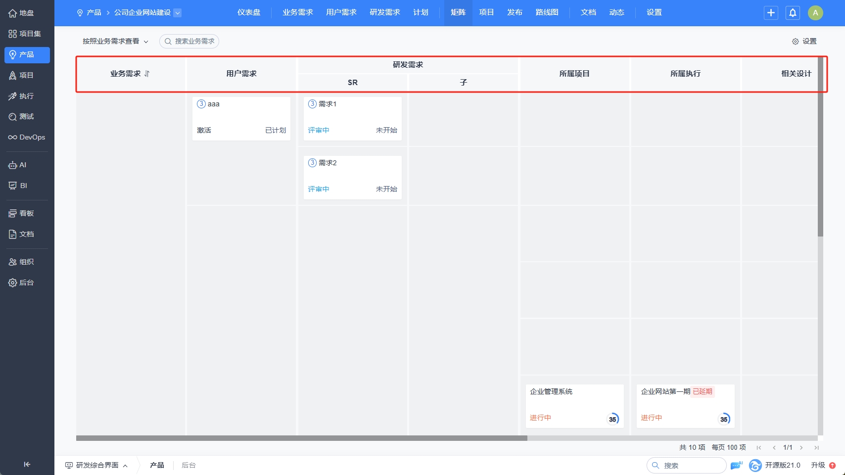 在“产品”-“矩阵”中,可以查看研发需求及其相关的任务、用例和Bug。