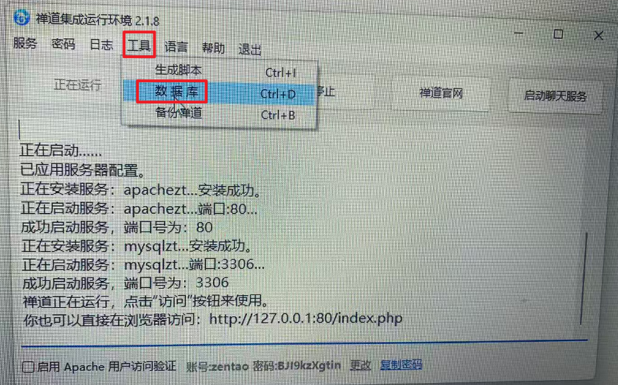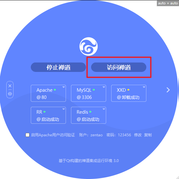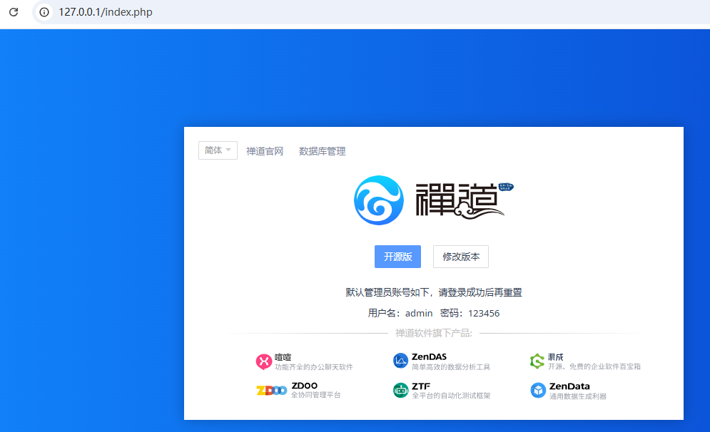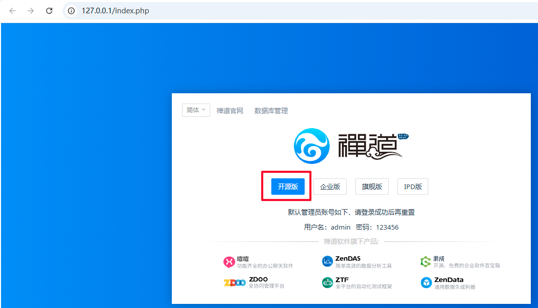 6.点击新Windows一键安装包集成运行环境的【访问禅道】登录禅道