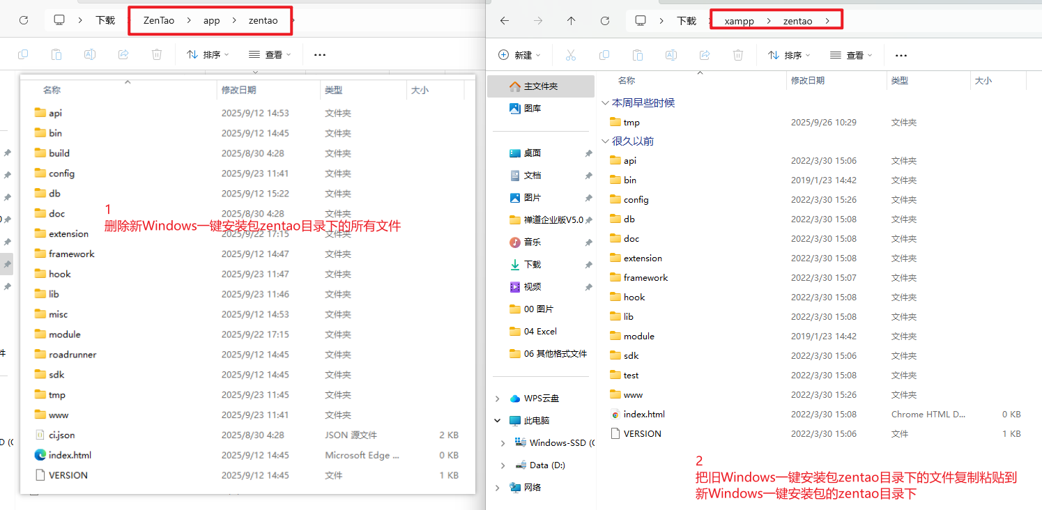4.删除新Windows一键安装包里的zentao目录的文件,把旧Windows一键安装包中的zentao目录文件复制粘贴到新Windows一键安装包的zentao目录下