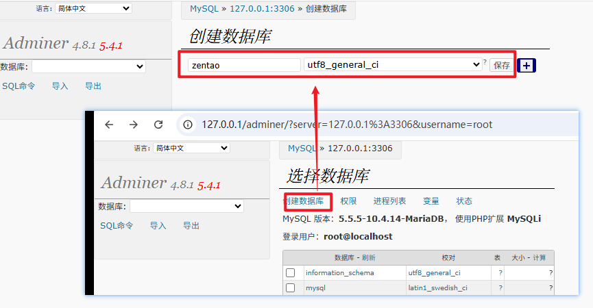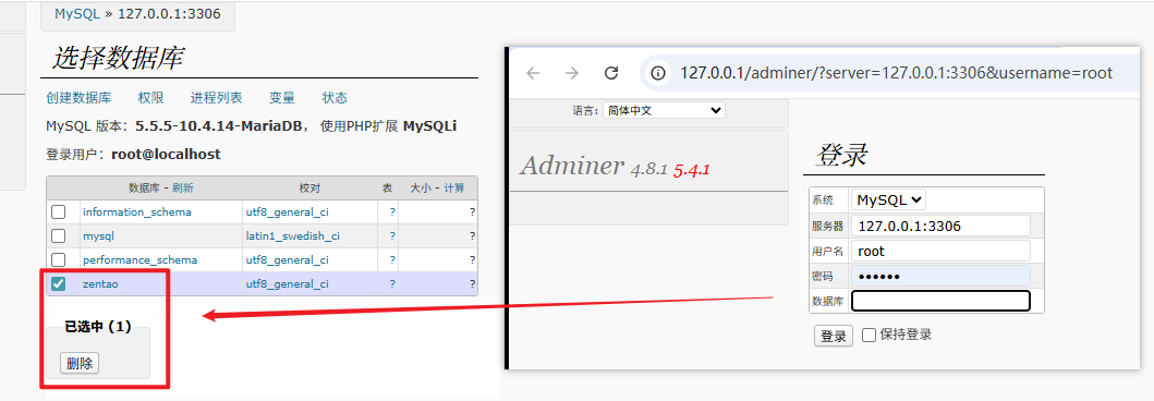 登录到新Windows一键安装包的数据库,删除掉原来的zentao数据库