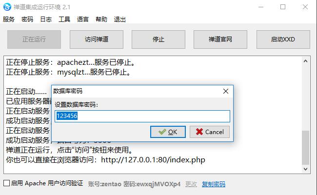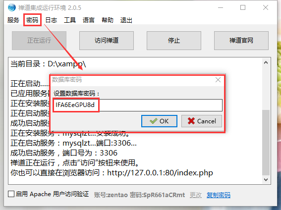 4、安装步骤中配置数据库时,数据库密码请务必填写禅道Windows一键安装包集成运行集成面板--密码--数据库密码里的密码。