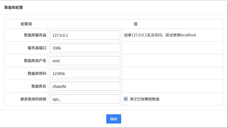 数据库名称填写 chanzhi 。建表使用的前缀填写 eps_ 。
