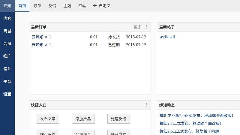 蝉知企业门户系统是我们团队开发的一款专向企业营销使用的企业门户系统,企业使用蝉知可以非常方便地搭建一个专业的企业营销网站,进行宣传,开展业务,服务客户。蝉知内置了文章、产品、论坛、评论、会员、博客、商城、帮助等功能,还可以集成微信。功能丰富实用,后台操作简洁方便。