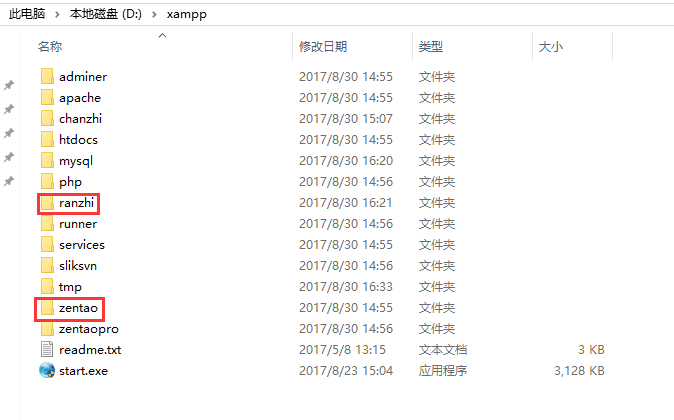 2、把ranzhi文件夹复制粘贴到禅道xampp包目录里