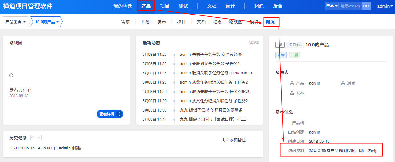 需要到产品---概况或者项目---概况里查看产品、项目的访问控制。