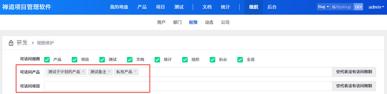 3、组织--权限里,进行视图权限维护,设置可以访问哪些功能模块,哪些产品和项目。