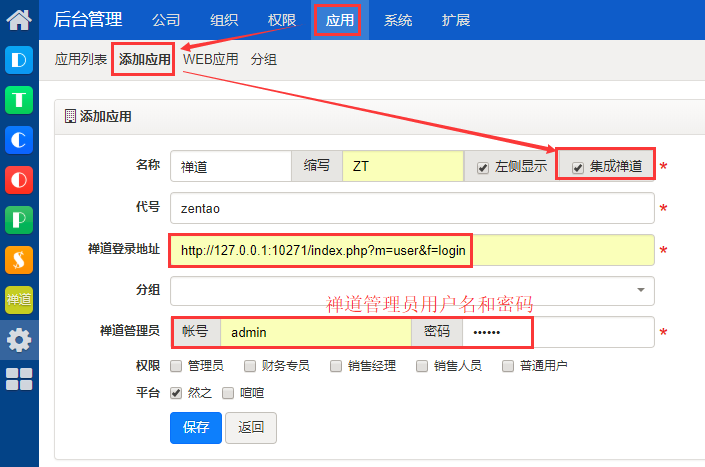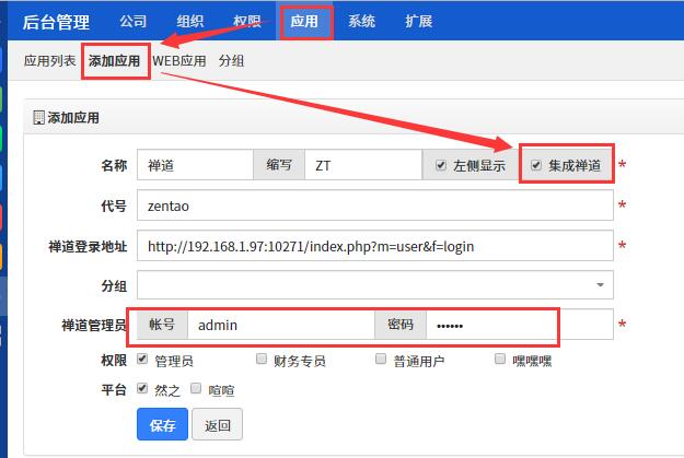 在然之后台管理---应用---添加应用,勾选集成禅道。