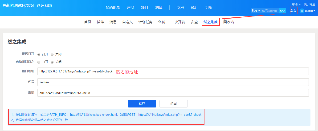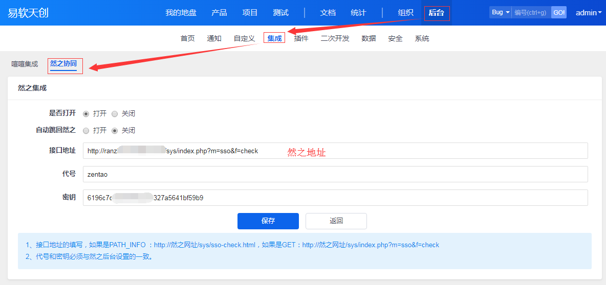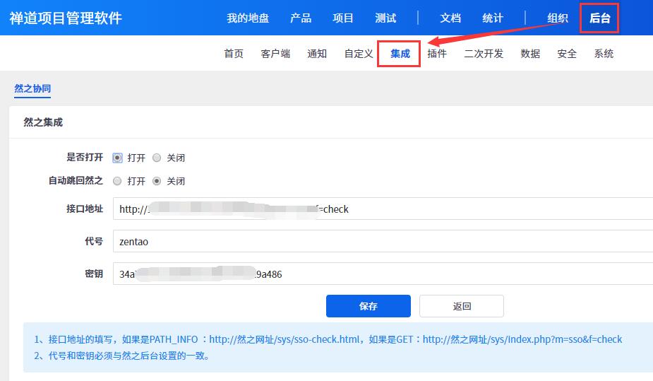 注:禅道10.6后,然之协同的集成设置位置做了调整,由原来的后台——然之集成改为后台——集成——然之协同。