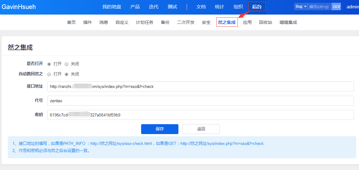 集成禅道的应用添加成功后,在禅道的后台里,会把接口地址和密钥同步过来。