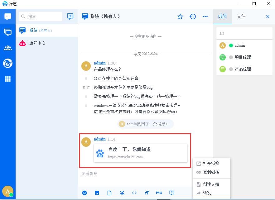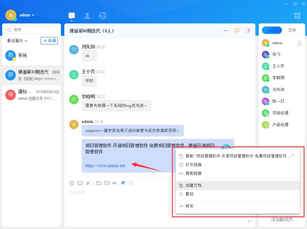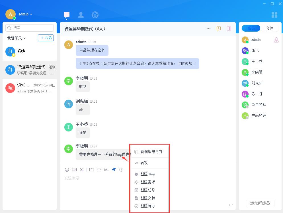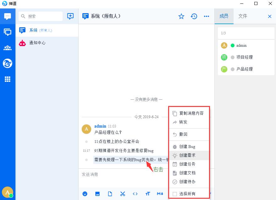 客户端消息可以直接右键创建Bug、需求、任务、文档、待办;