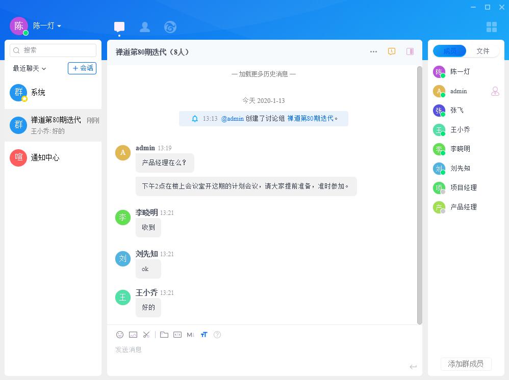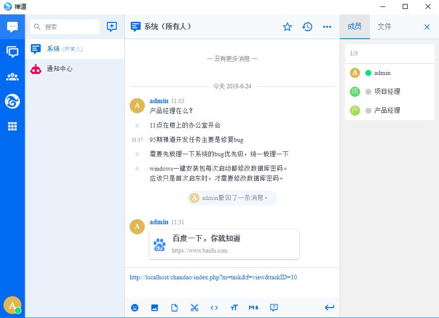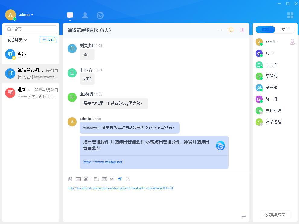 禅道客户端登录成功页面,那么现在你可以跟你的小伙伴开始聊天讨论了。