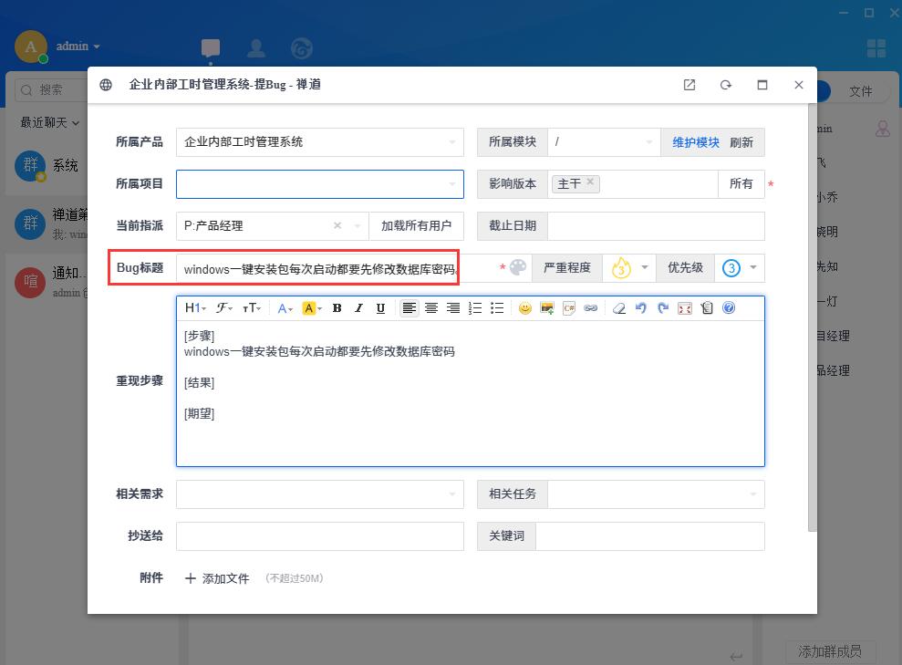禅道里的操作可以通过客户端机器人发送消息提醒;