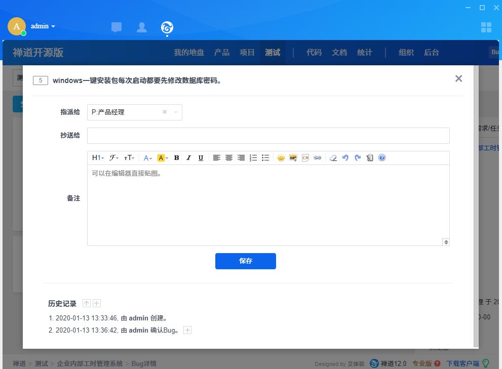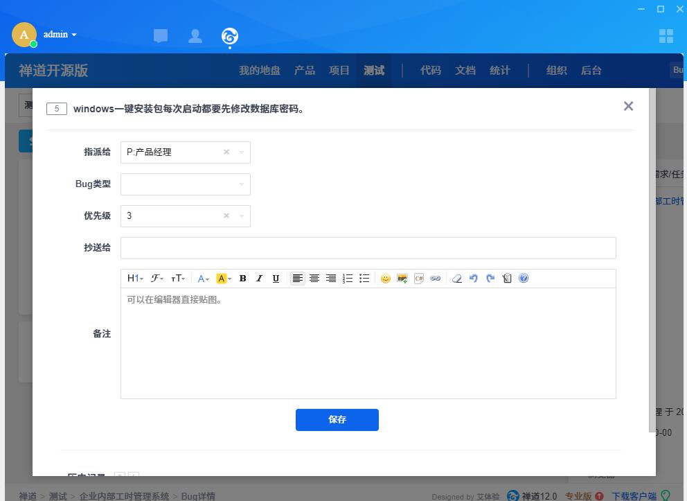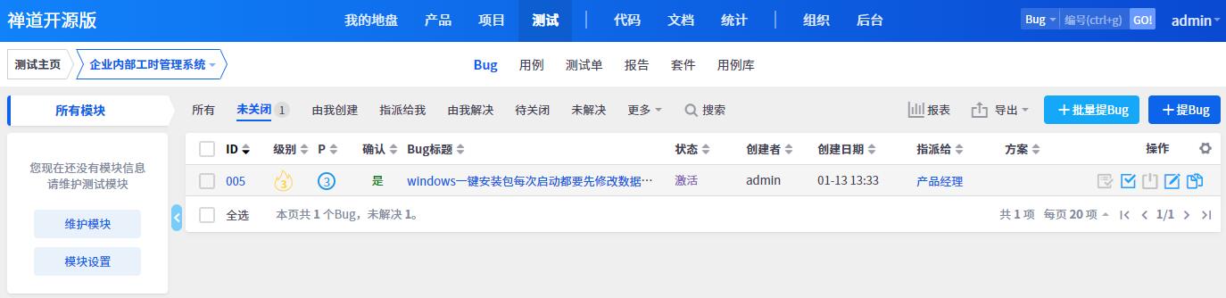 禅道界面也已同步记录创建成功的Bug: