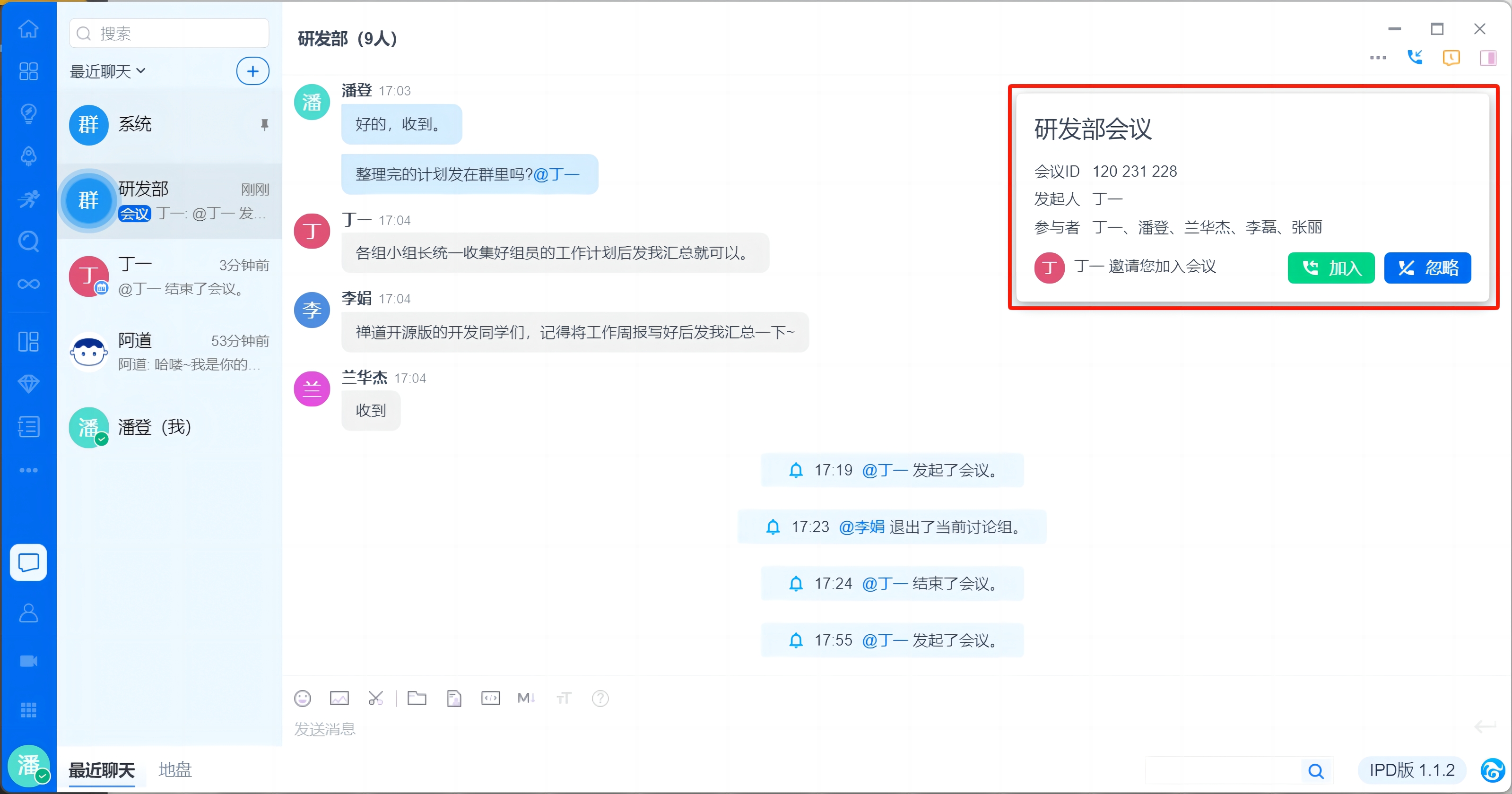 受邀用户都将在阿道会话中收到会议邀请,邀请信息包含:会议主题、发起人、会议时间、参会人及参会部门。